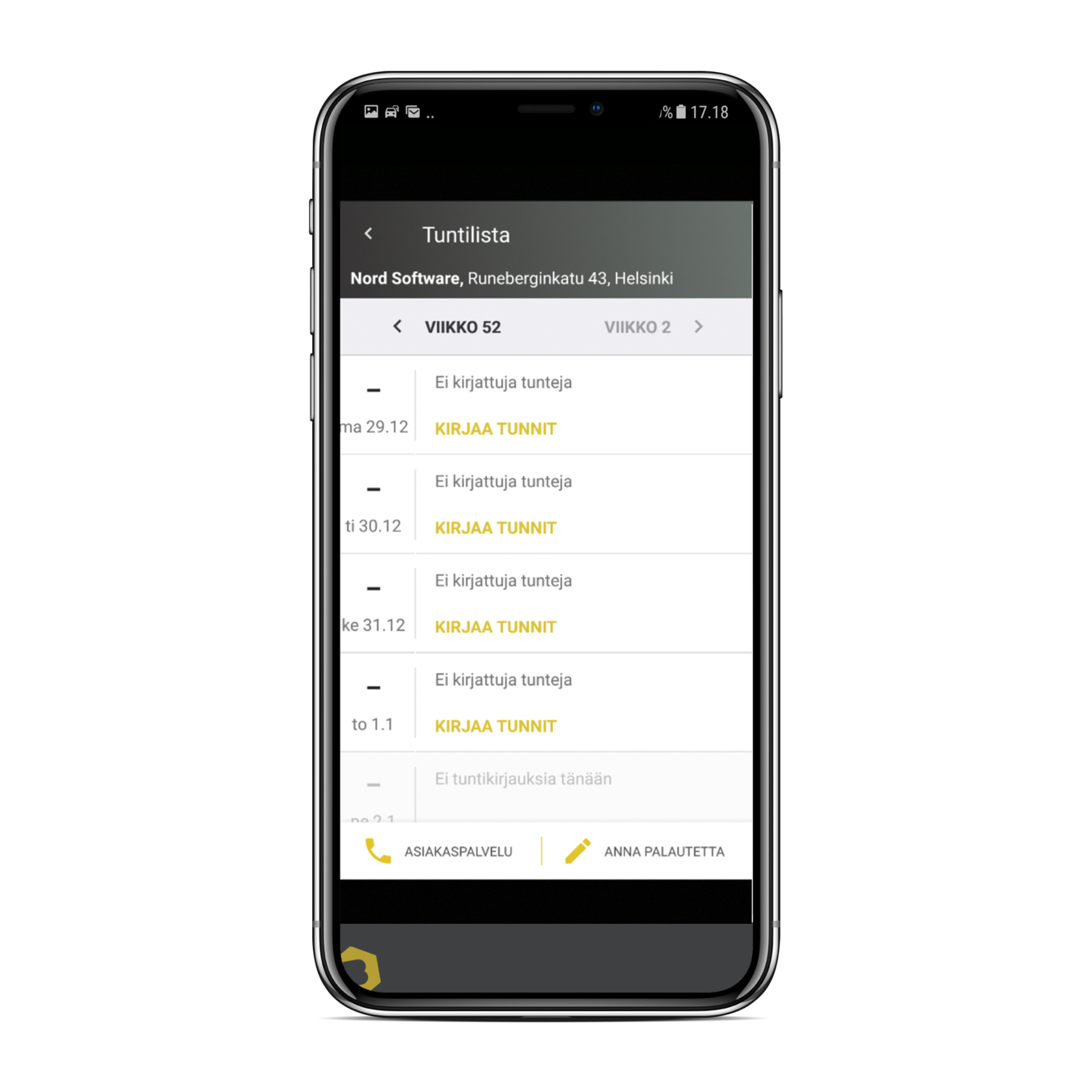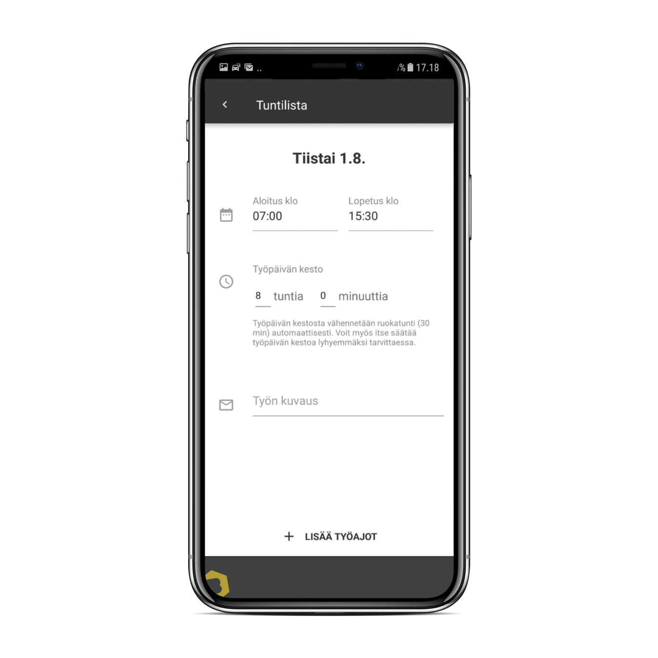 Voit syöttää työpäivän tunnit, työn keston, työnumeron ja mahdolliset työajot työpäiväkohtaisessa näkymässä.