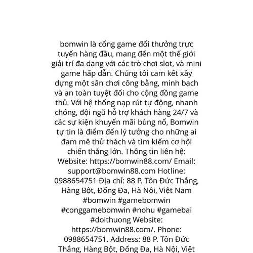 Website: https://bomwin88.com/. bomwin là cổng game đổi thưởng trực tuyến hàng đầu, mang đến một thế giới giải trí đa dạng với các trò chơi slot, và mini game hấp dẫn. Chúng tôi cam kết xây dựng một sân chơi công bằng, minh bạch và an toàn tuyệt đối