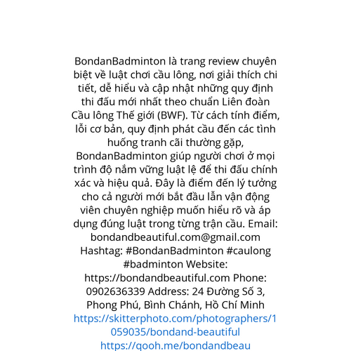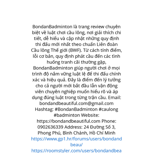 Website: https://bondandbeautiful.com BondanBadminton là trang review chuyên biệt về luật chơi cầu lông, nơi giải thích chi tiết, dễ hiểu và cập nhật những quy định thi đấu mới nhất theo chuẩn Liên đoàn Cầu lông Thế giới (BWF). Từ cách tính điểm, lỗi