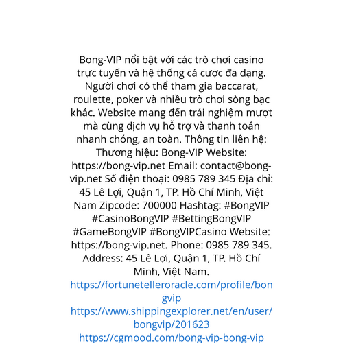 Website: https://bong-vip.net. Bong-VIP nổi bật với các trò chơi casino trực tuyến và hệ thống cá cược đa dạng. Người chơi có thể tham gia baccarat, roulette, poker và nhiều trò chơi sòng bạc khác. Website mang đến trải nghiệm mượt mà cùng dịch vụ hỗ