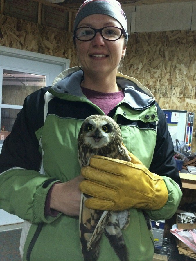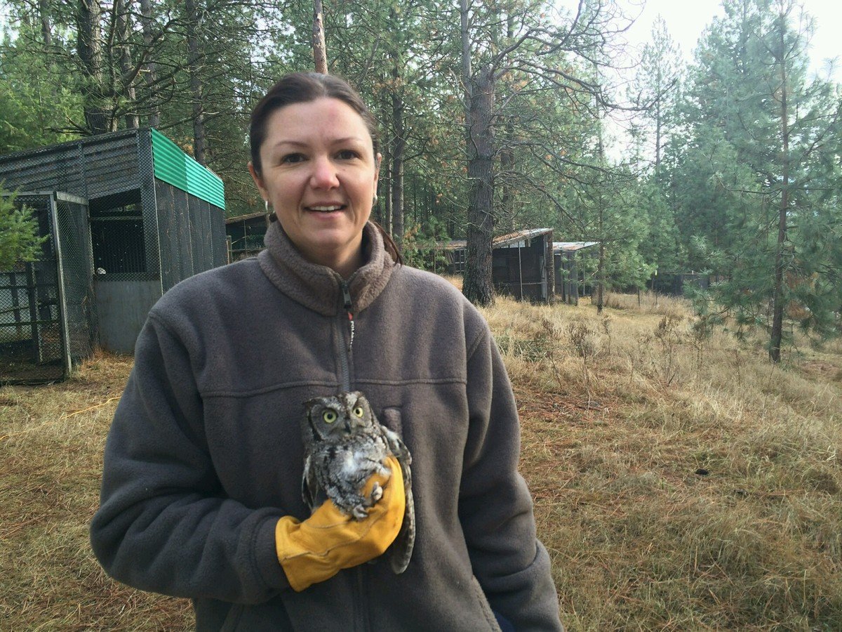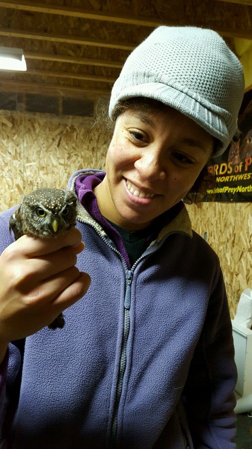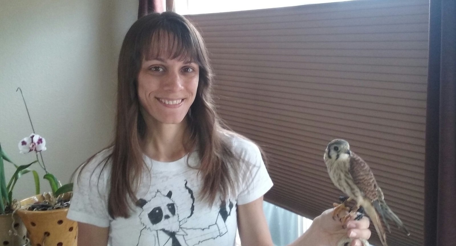 Kristen, intern, and Cleo the American Kestrel, an educational bird at Birds of Prey Northwest
