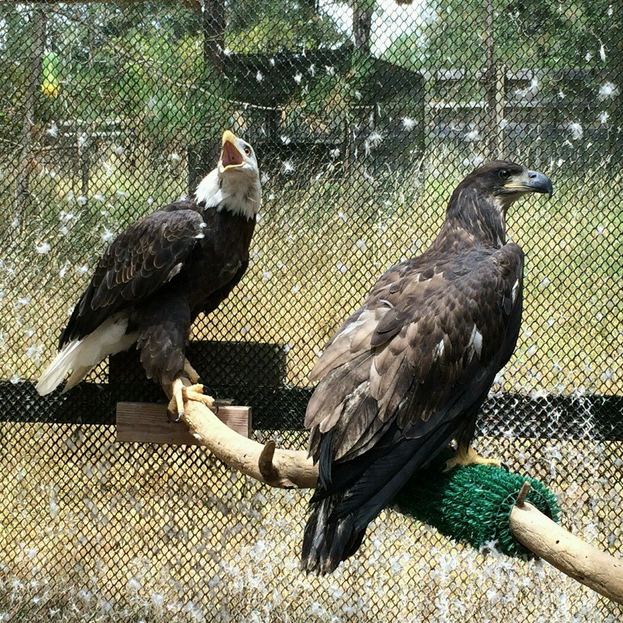 Resident bald eagle Avista acted as foster parent to an orphaned bald eagle, still showing his immature brown plumage and dark beak, whose nest collapsed.