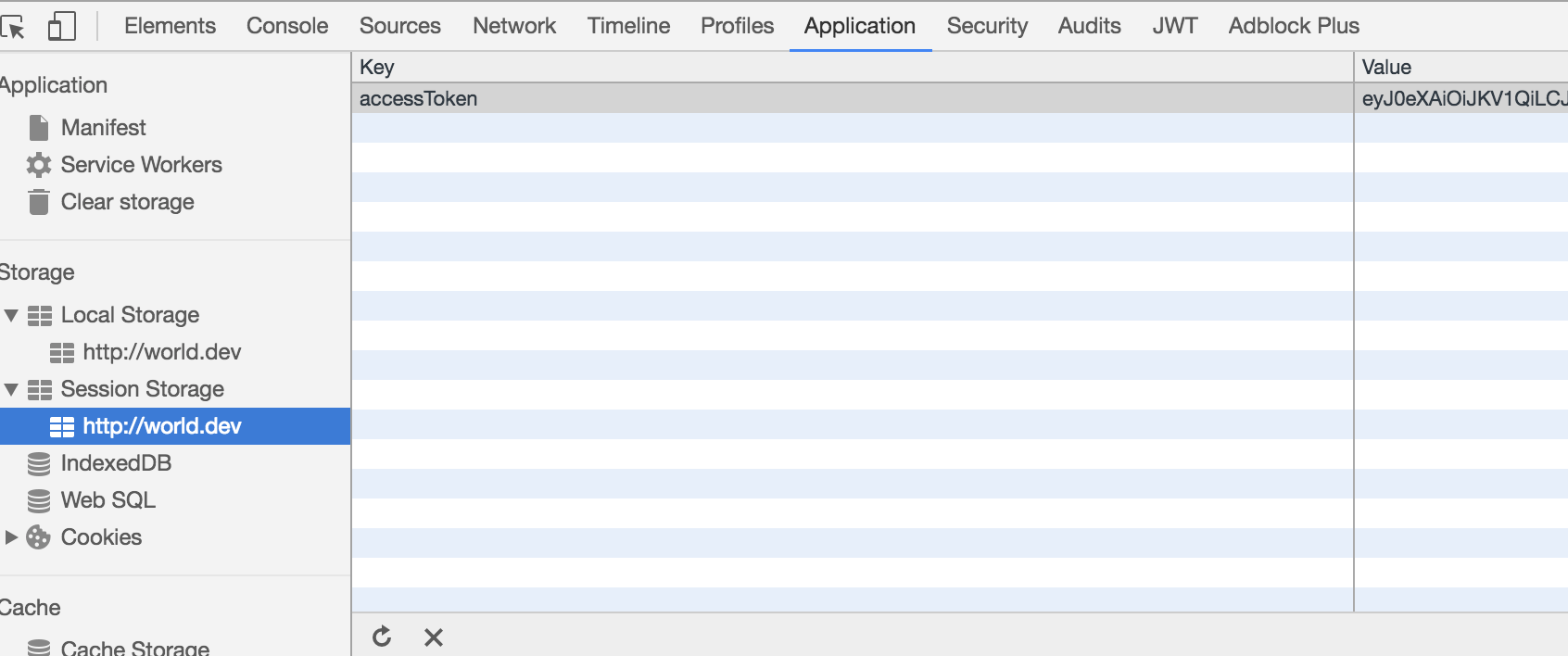 window.sessionStorage.accessToken = 'eyJ0eXAiOiJKV1QiLCJhbGciOiJIUzI1NiJ9.eyJzdWIiOiIxMjM0NTY3ODkwIiwibmFtZSI6IkpvaG4gRG9lIiwiYWRtaW4iOnRydWUsImp0aSI6ImM2NTcxZjg2LWNjODktNGY2Ny1iOTEzLTVjN2ZlMTcxM2Y1OSIsImlhdCI6MTQ3OTM5MDQ5OSwiZXhwIjoxNDc5Mzk0MDk5fQ.Yuy7VeMNKqKwmSCTXHQ_DdOrg2v42afKgZzmg8ISIIE';