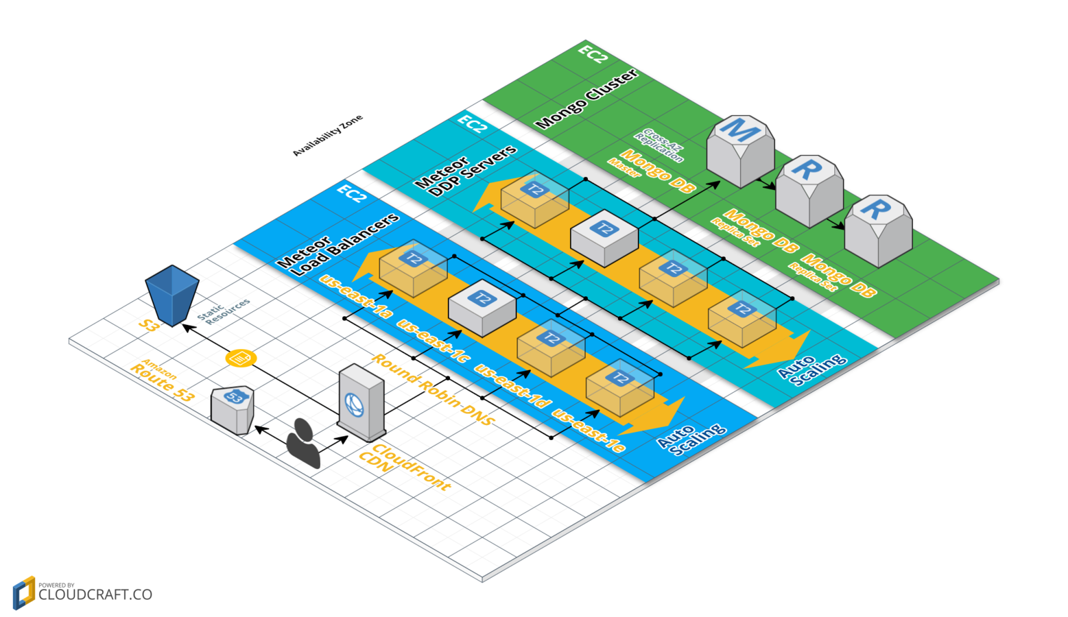- Highly available (across AZ's), scalable architecture (auto-scaling + MongoDB sharding/replicas).