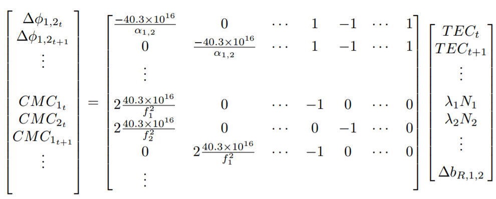 CMC_f \approx \frac{40.3\times 10^{16}}{f^2}TEC - \lambda_f N_{S,f} + \cdots