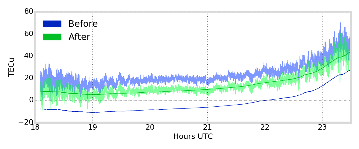 Example of L1/L2 TEC before and after code-carrier-levelling / ambiguity estimation, for satellite G01 and receiver at Poker Flat, Alaska.