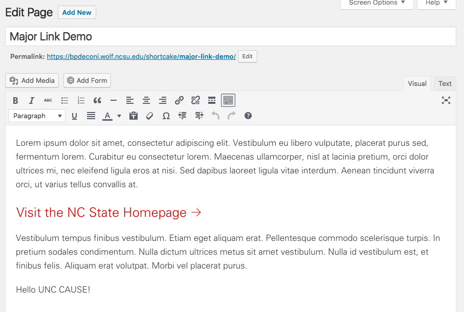 add_action('init', 'register_shortcode');[major-link url="https://www.ncsu.edu/"]Visit the NC State Homepage[/major-link]Example: