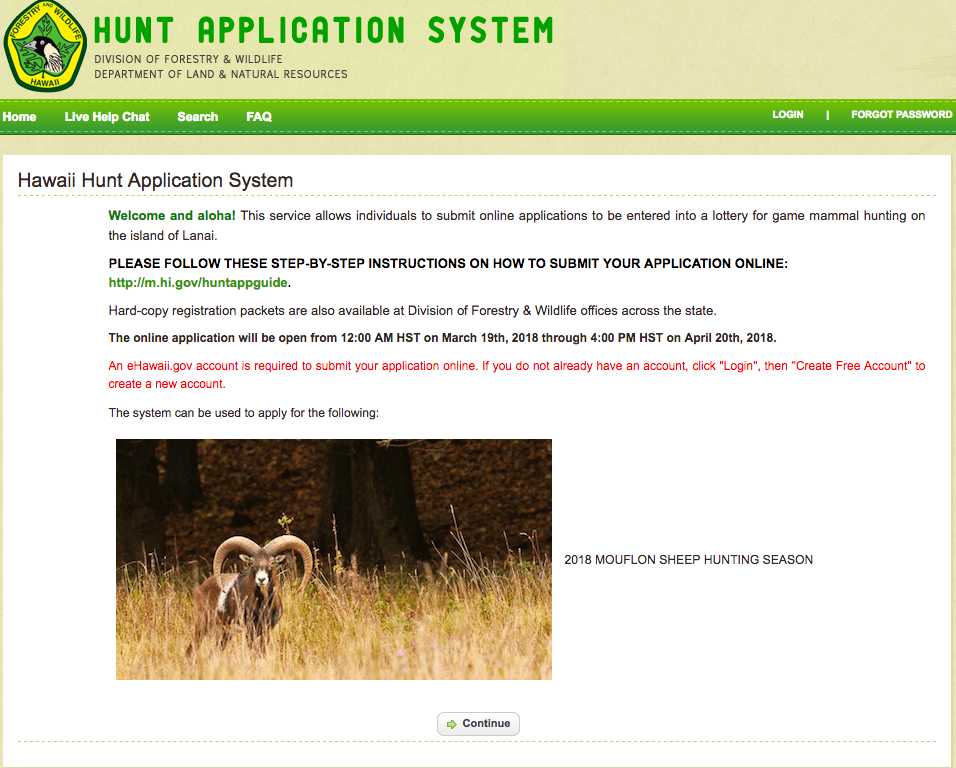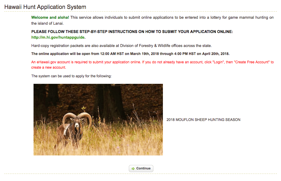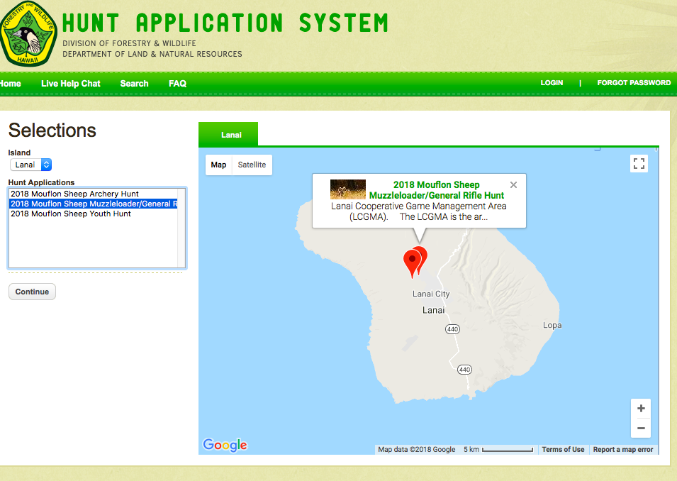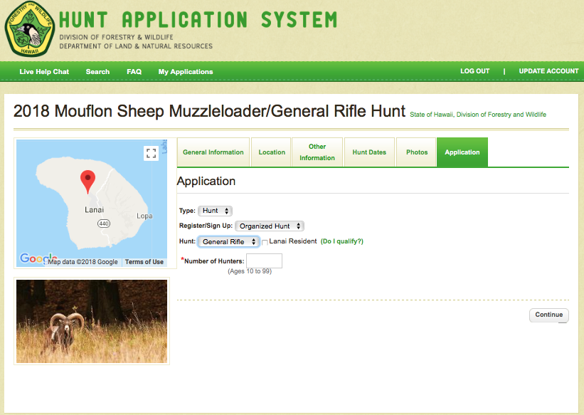 Submit your archery, general rifle, muzzleloader or youth application to participate in the 2018 Lanai Mouflon Sheep Hunting Season online.