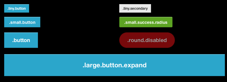 <!-- Size Classes --><a href="#" class="button">Default Button</a> <a href="#" class="tiny button">Tiny Button</a> <a href="#" class="small button">Small Button</a> <a href="#" class="large button">Large Button</a> <!-- Color Classes --> <a href="#" class="button secondary">Secondary Button</a> <a href="#" class="button success">Success Button</a> <a href="#" class="button alert">Alert Button</a>