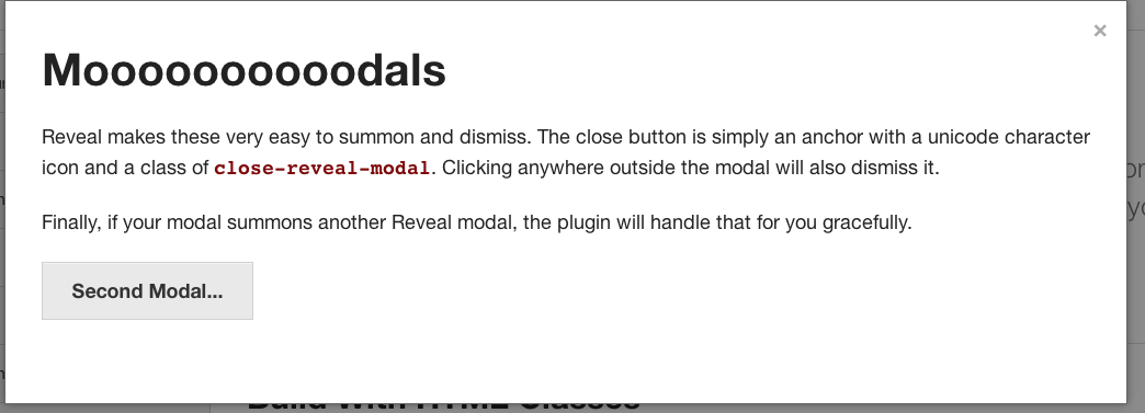 <div id="myModal" class="reveal-modal"><h2>Moooooooodals</h2><p class="lead">Your couch. It is mine.</p><p>Im a cool paragraph that lives inside of an even cooler modal. Wins</p><a class="close-reveal-modal">×</a></div>