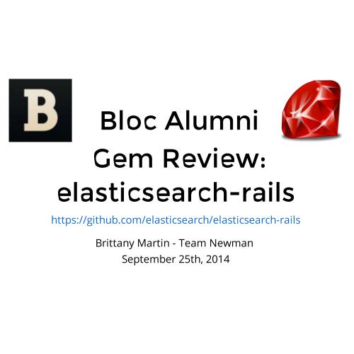 Brittany presented to the Bloc Alumni gem review group what she has learned about Elasticsearch (history, implemenation, gems and how you can try it yourself).