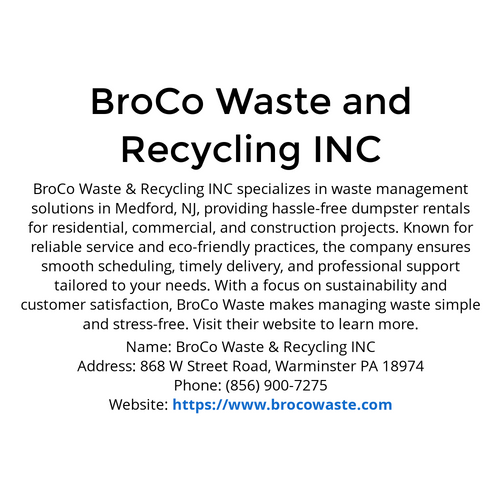 https://www.brocowaste.com BroCo Waste & Recycling INC delivers reliable waste management services in Medford, NJ, offering eco-friendly and hassle-free dumpster rentals for all projects.