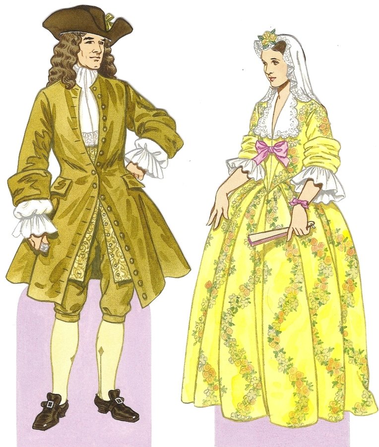 荷蘭式服裝(1620~1650A.D.)和法國式服裝(1650~1730A.D.) 。荷蘭式服裝的特色為(Lace、Leather、Long Locks)。