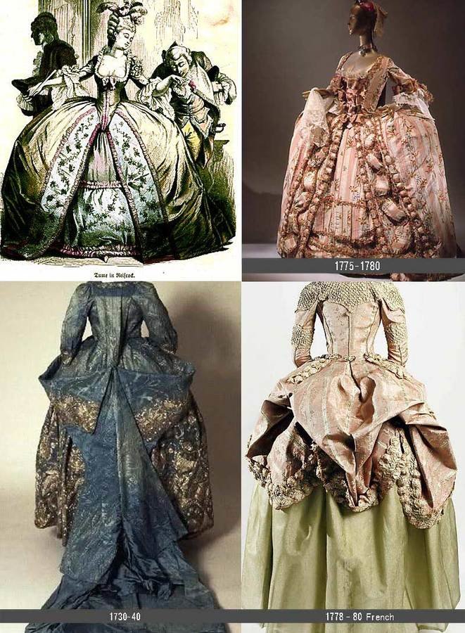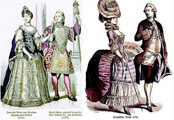 女裝的特點是大量褶皺和蕾絲,無數的花飾。上衣流行緊身胸衣,外面套無袖的短外衣,腰部是成“V”字形收緊,裙子仍然時興蓬松的,使用多穿裙子的方法。袖子有長有短,都鑲著大量蕾絲,有時候袖子打成很多段,每段都鑲嵌蕾絲,非常華麗。