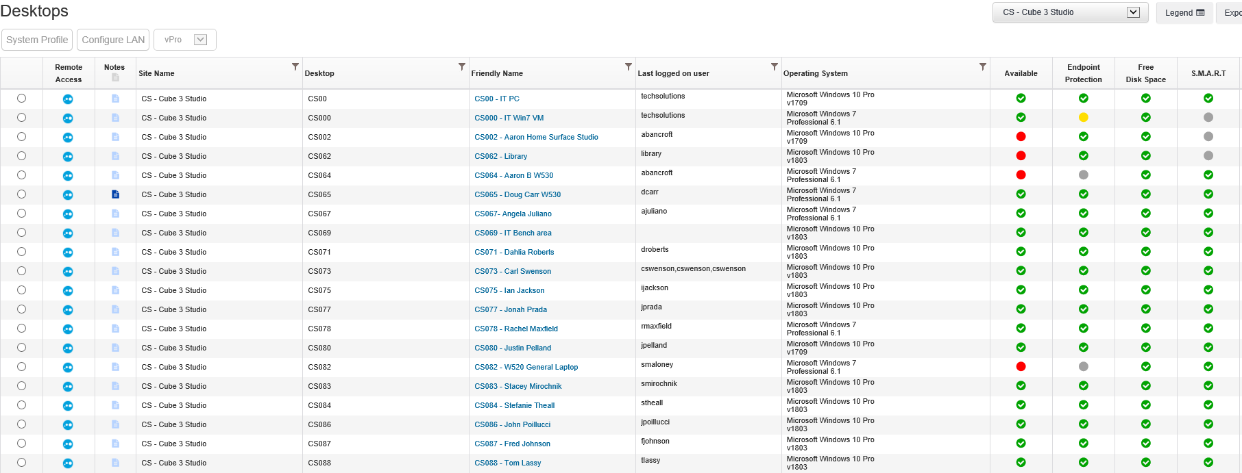 - Monitor health of workstations such as disk space, applications installed, inventory, ability to run scripts to make changes/install software