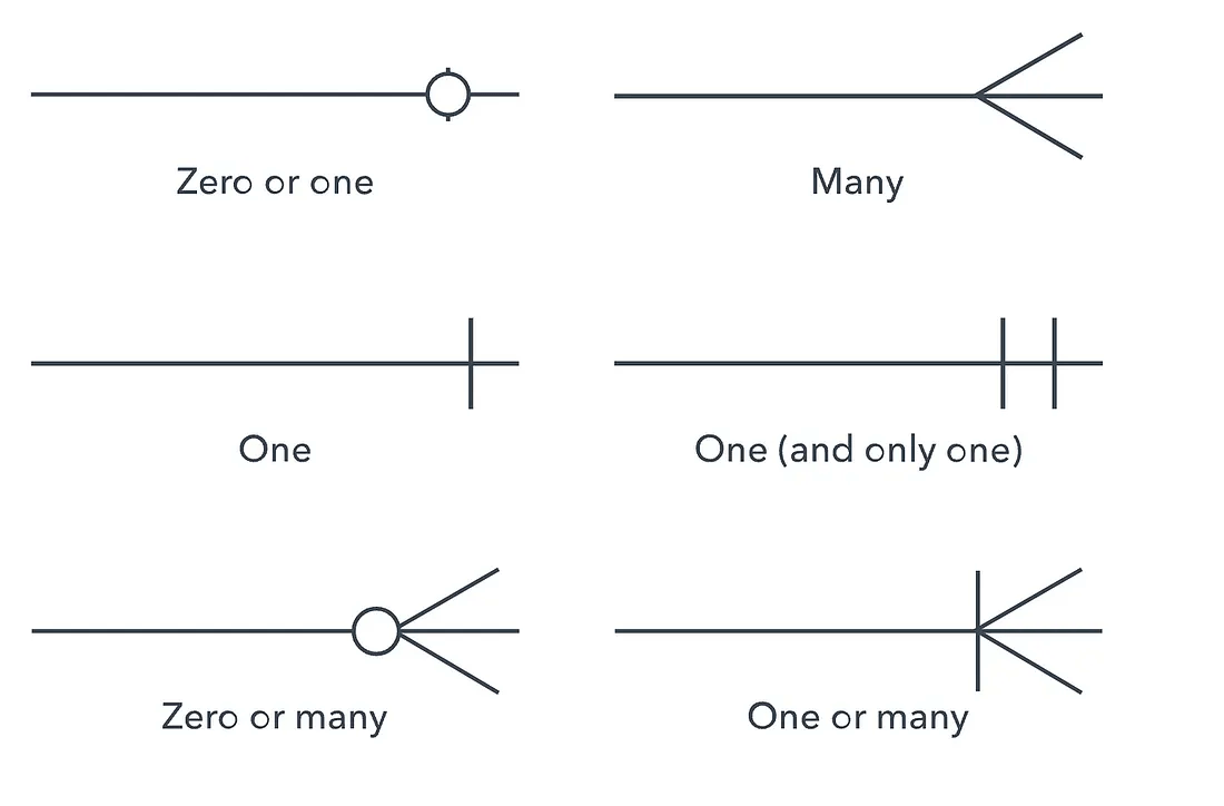 Vi använder Kråkfotsnotation för att visa mängden i en relation (kardinalitet):