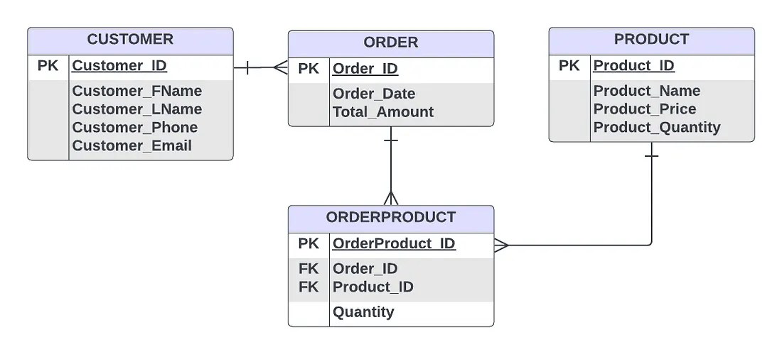 - Produkt till OrderProduct : På liknande sätt är detta också en en-till-många- relation, eftersom varje produkt kan förekomma i flera OrderProduct- poster.