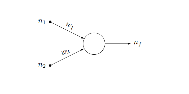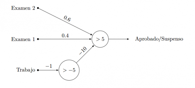 La unidad básica de la red neuronal es el perceptrón. Las entradas son las dos notas, n1 y n2, cada una con su correspondiente peso