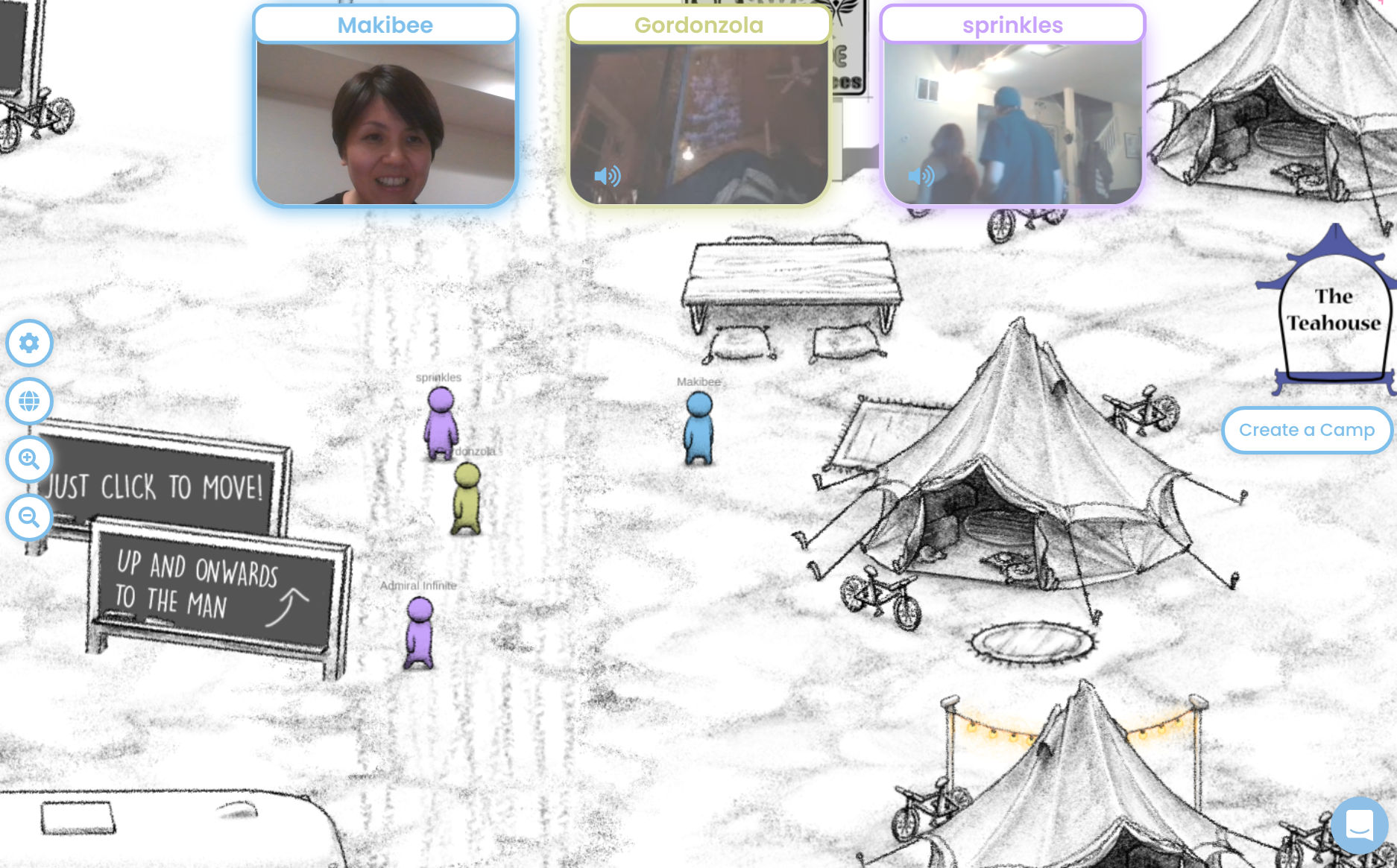 モノクロのスケッチ調の2Dマップ+映像チャット。アバターどうしが近づくと話せて、自分のキャンプを作り上げて招待する事もできる。