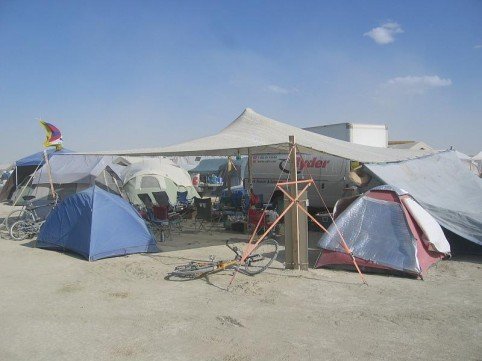 バーニングマンでは、何かに使用した水は全て汚水で地面に撒くのはご法度。以前は汚水を黒いゴミ袋で作った池で出来るだけ乾かすようにしていましたが、中身が風で飛び散るのもあり今は非推奨。バケツやタンクに入れて持ち帰ります。