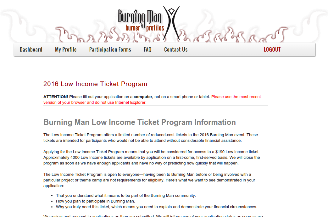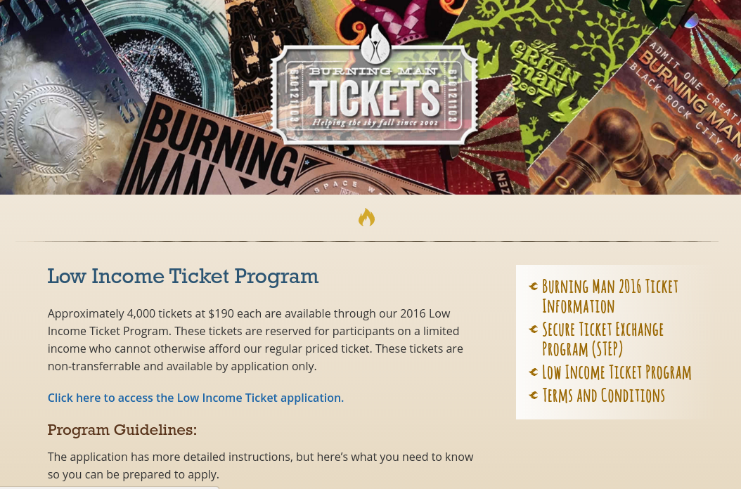 Early entrance before Sunday, August 28, 2016 is only given to those working with the infrastructure of the event, a placed art installation or a placed theme camp. Early arrival permission is not given as part of being awarded a Low Income ticket. Early Arrival permission must be obtained from the department or group with which you are working. You cannot pick your ticket up before Will Call opens, regardless of the date your department has given permission to arrive on.