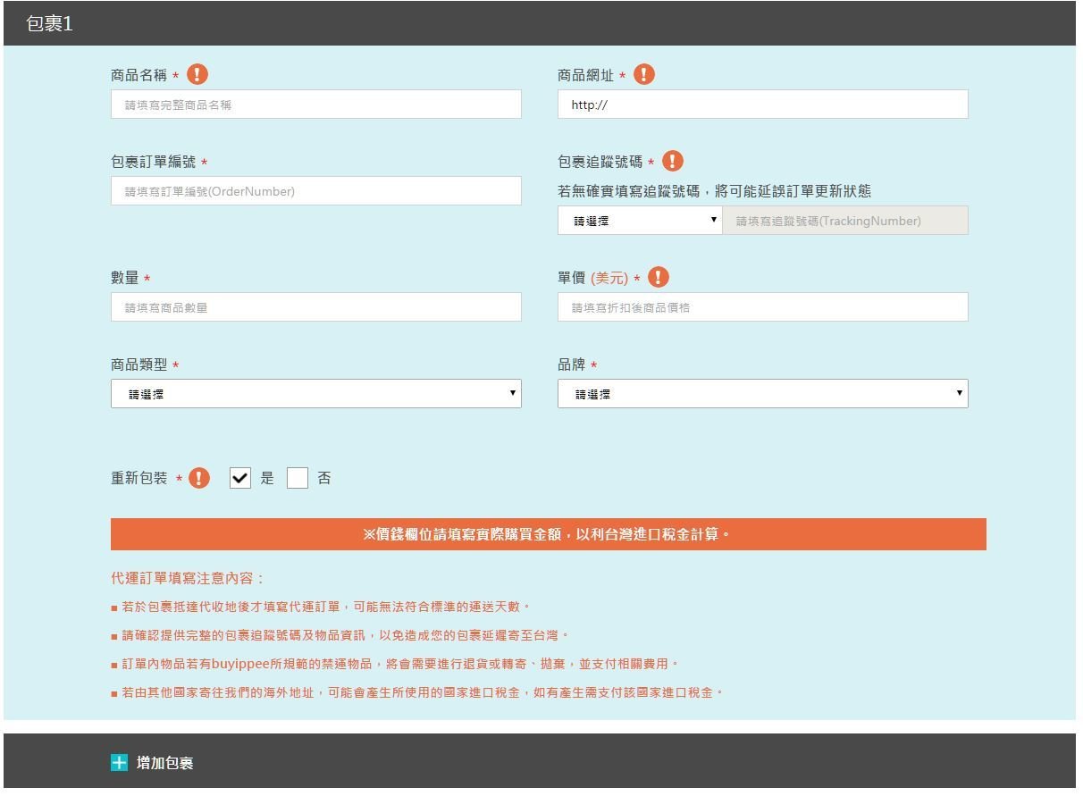 如果一次想要代運多個包裹,新增完第一個包裹後,請點選"增加包裹",