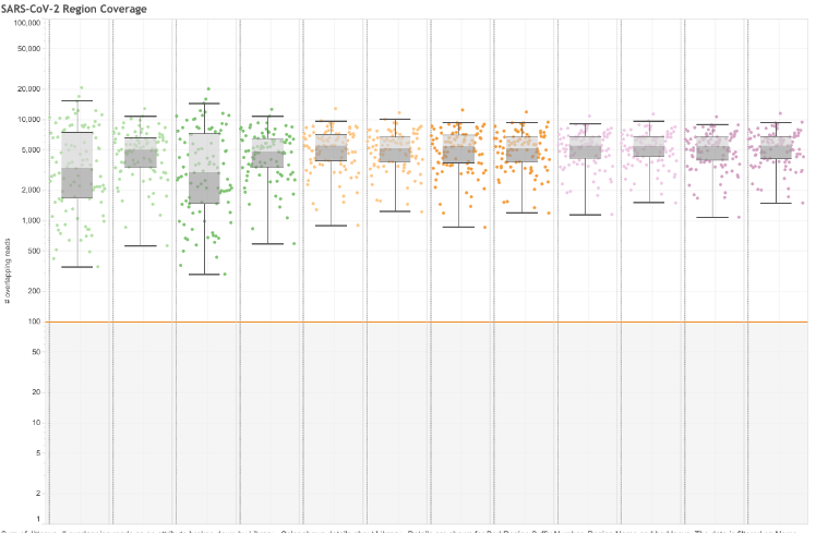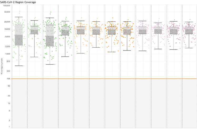 Orange ARTIC v3 primers overlap with a lineage of concern (yellow). Many ARTIC primers overlap sites with more than 2500 variant observations (red)