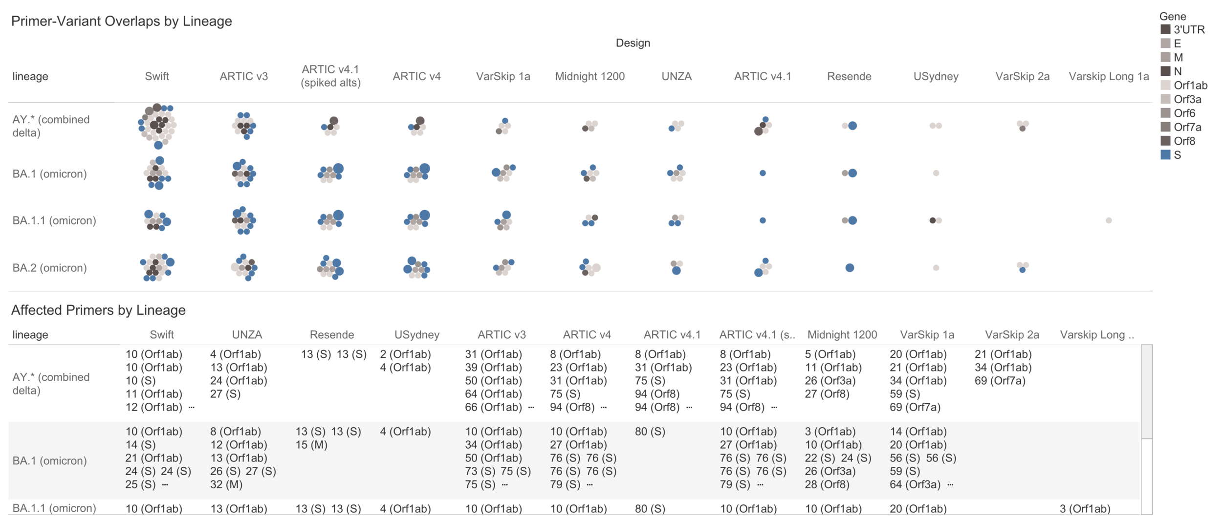 Varskip-long and varskip-short primers do not overlap >2500 variant sites (red) or variants from lineages of concern (yellow).