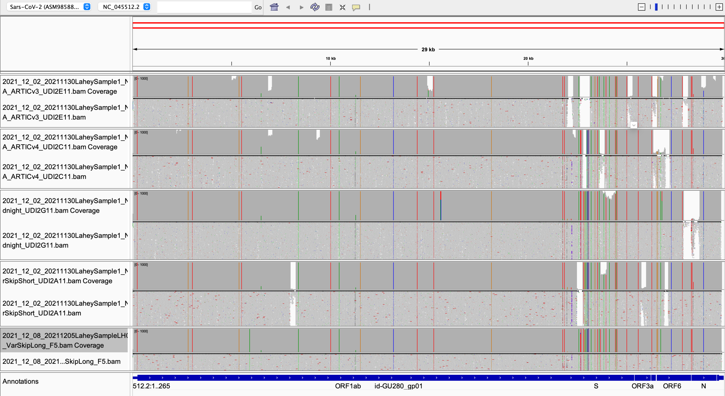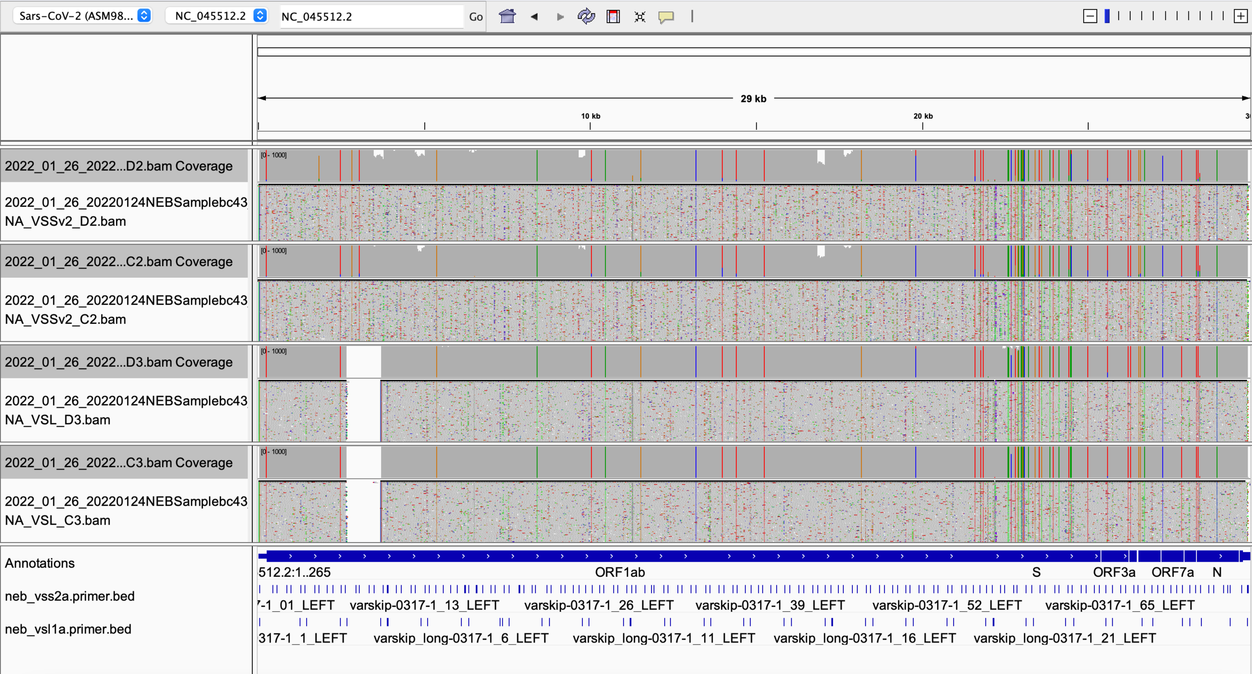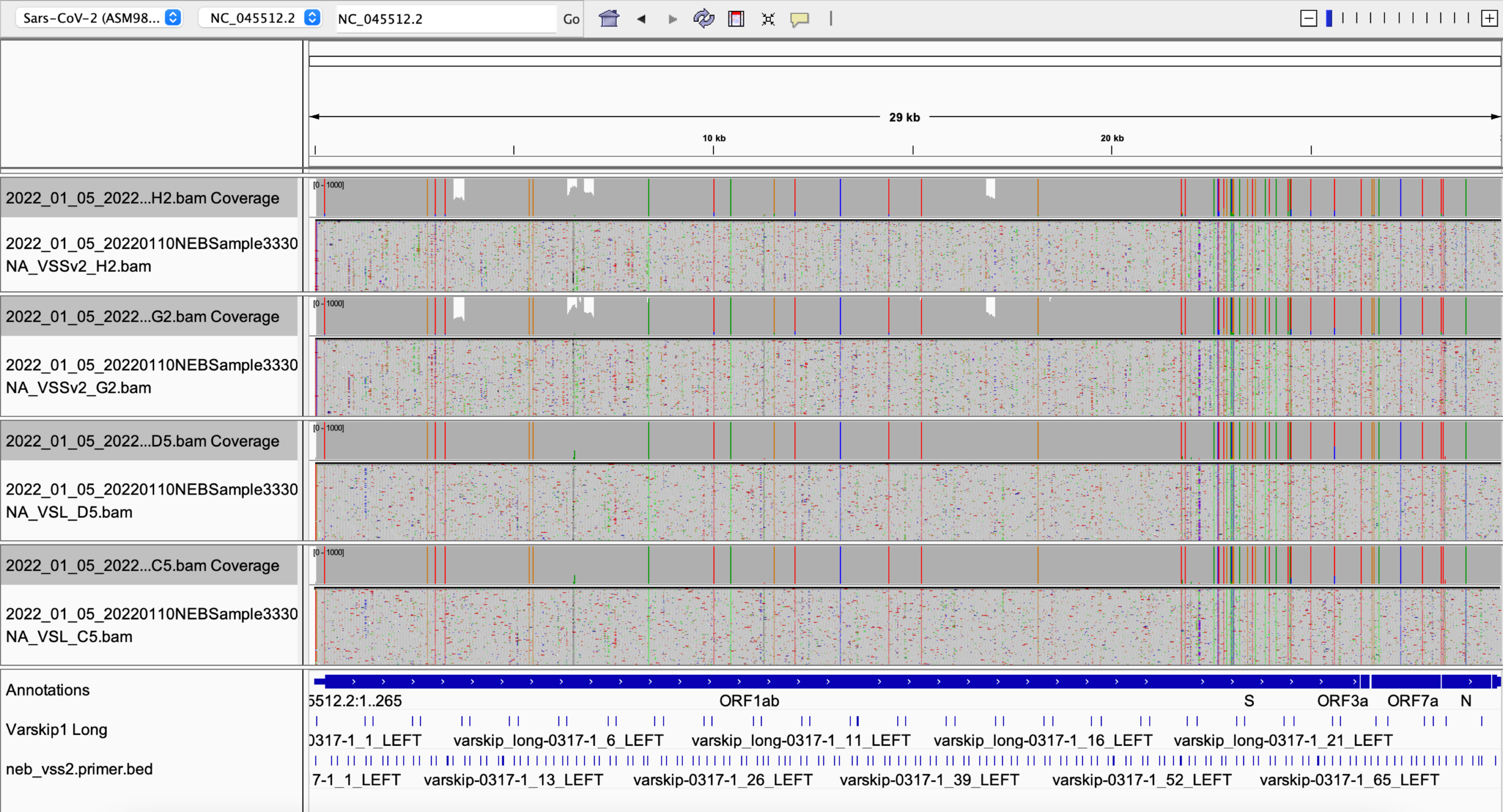 Consensus sequences classified as B.1.617.2 (Delta) in Massachusetts (where VarSkip Short was field tested) were collected from NCBI Virus and partitioned into 2613 ARTICv3 and 1319 VarSkip Short sequences using the SRA “design” field (NEB_VarSkip_v1 = VarSkip Short, others assumed to be ARTICv3). Reads were aligned to the NC_045512.2 reference using minimap2 (minimap2 -x asm5) and visualized using IGV. Consensus sequences generated from VarSkip amplicons suffered fewer dropouts (indicated by arrows).