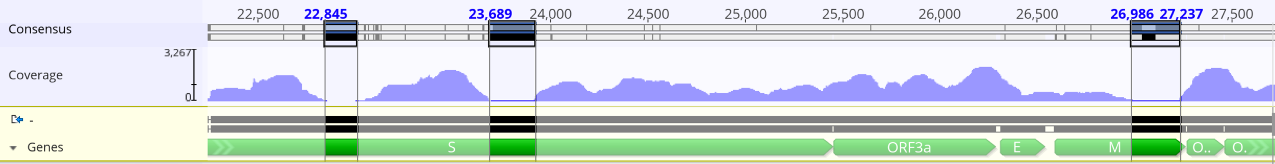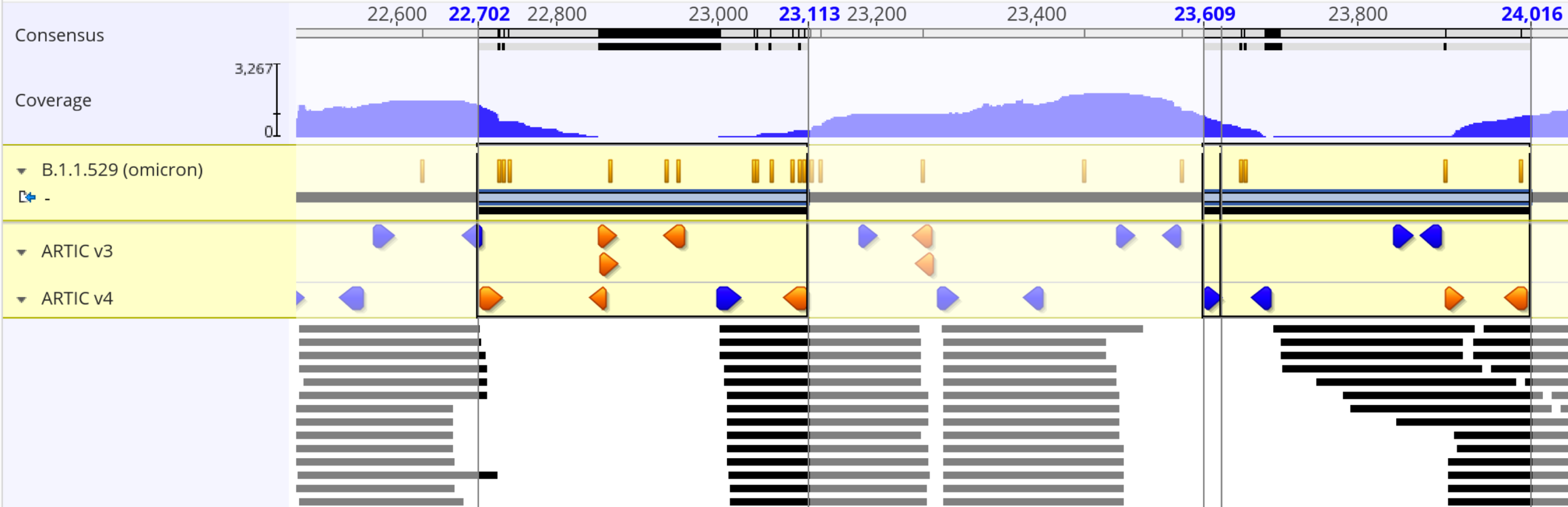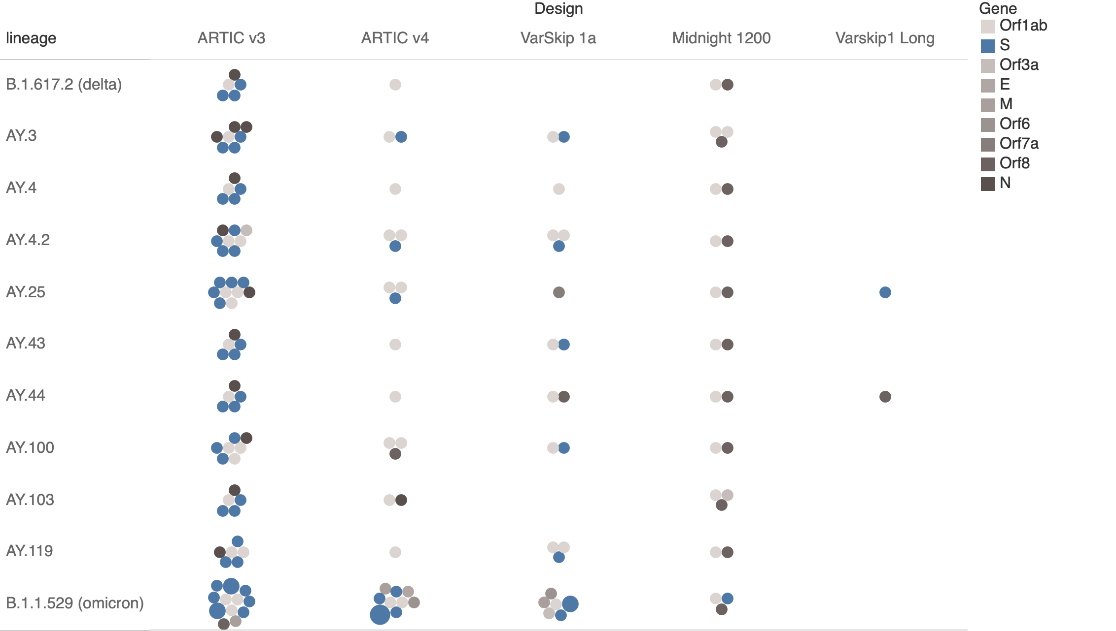 Orange ARTIC v3 primers overlap with a lineage of concern (yellow).  Many ARTIC primers overlap sites with more than 2500 variant observations (red)