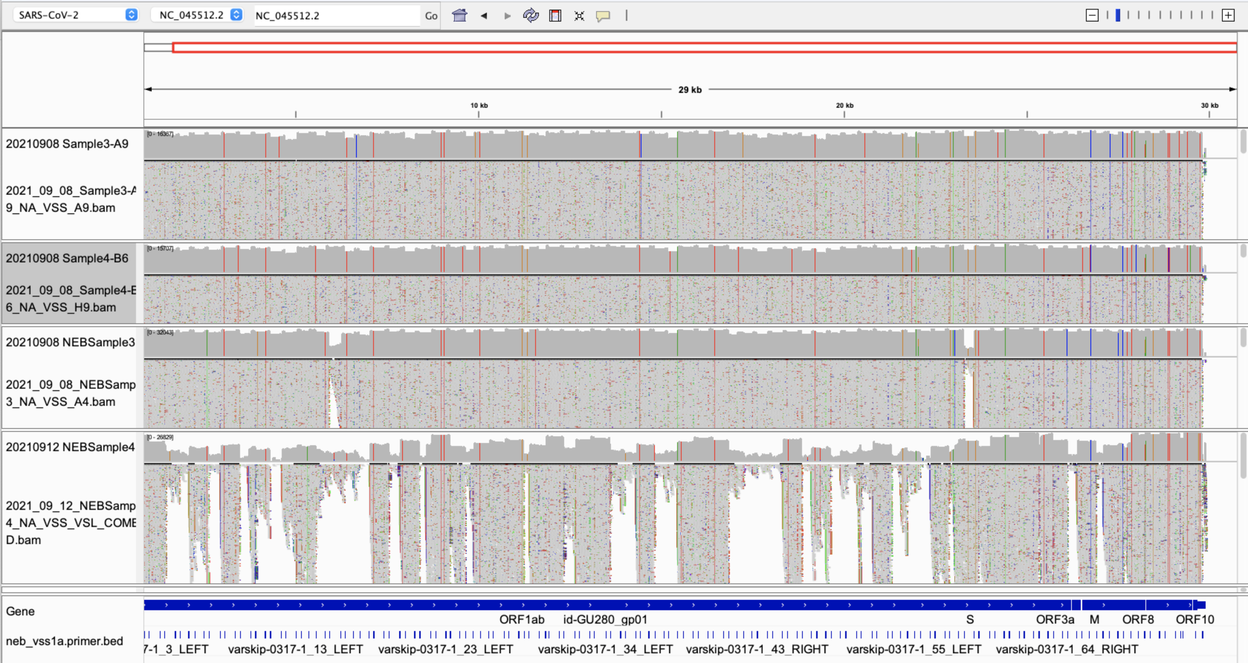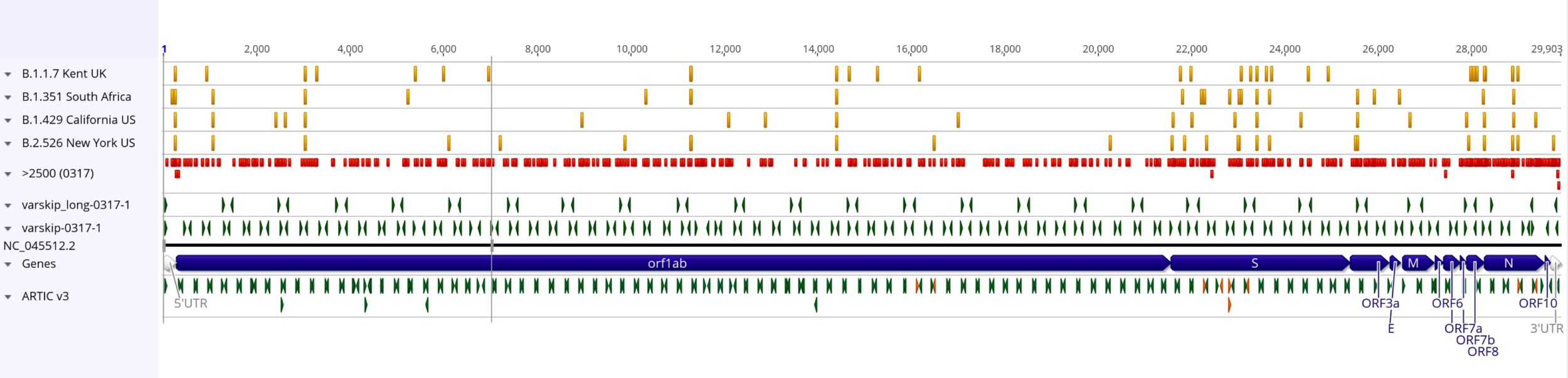 High mutation rates observed in RNA viruses like SARS-CoV-2 have been shown to disrupt amplification based detection and sequencing methods. To produce a more variant-resistant sequencing method, we identified all variants observed more than 1000 times in consensus sequences present in GISAID. We produced thousands of multiplex PCR designs and identified those that were least affected by known variants. During product development and scale-up, we periodically evaluated designs comparing with variants that arose during product development. NEB VarSkip designs exhibited fewer primer site variant overlaps than ARTICv4 or Midnight primer schemes.