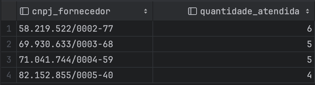 query = '''select cnpj_fornecedor fornecedor, count(*) quantidade_pedidos