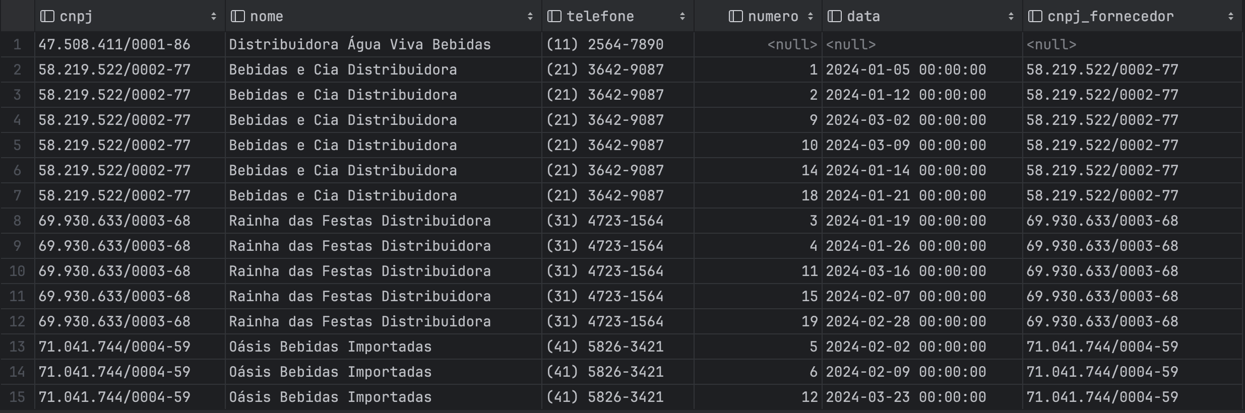 | 001 | 01/01/2024 | 57.381.404/0001-90 | Forn. A | (61) 3722-6845 | P-23 | Pepsi | 5,99 | 180 |