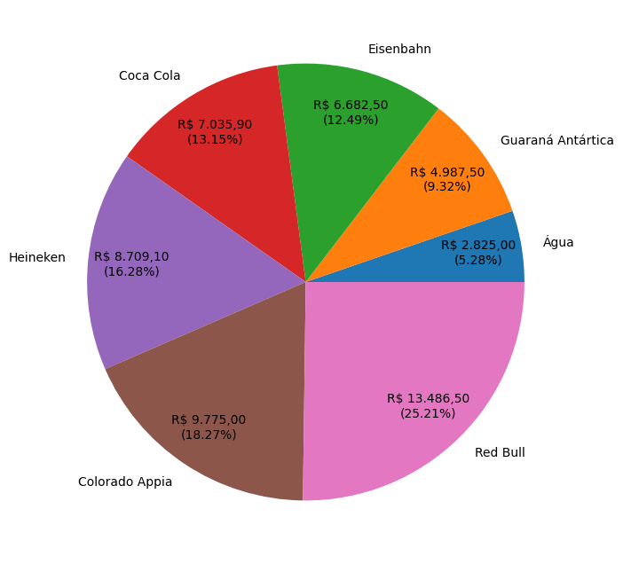 plt.pie(df_faturamento_produtos['faturamento'], labels=df_faturamento_produtos['nome'], autopct=my_fmt, pctdistance=0.8)