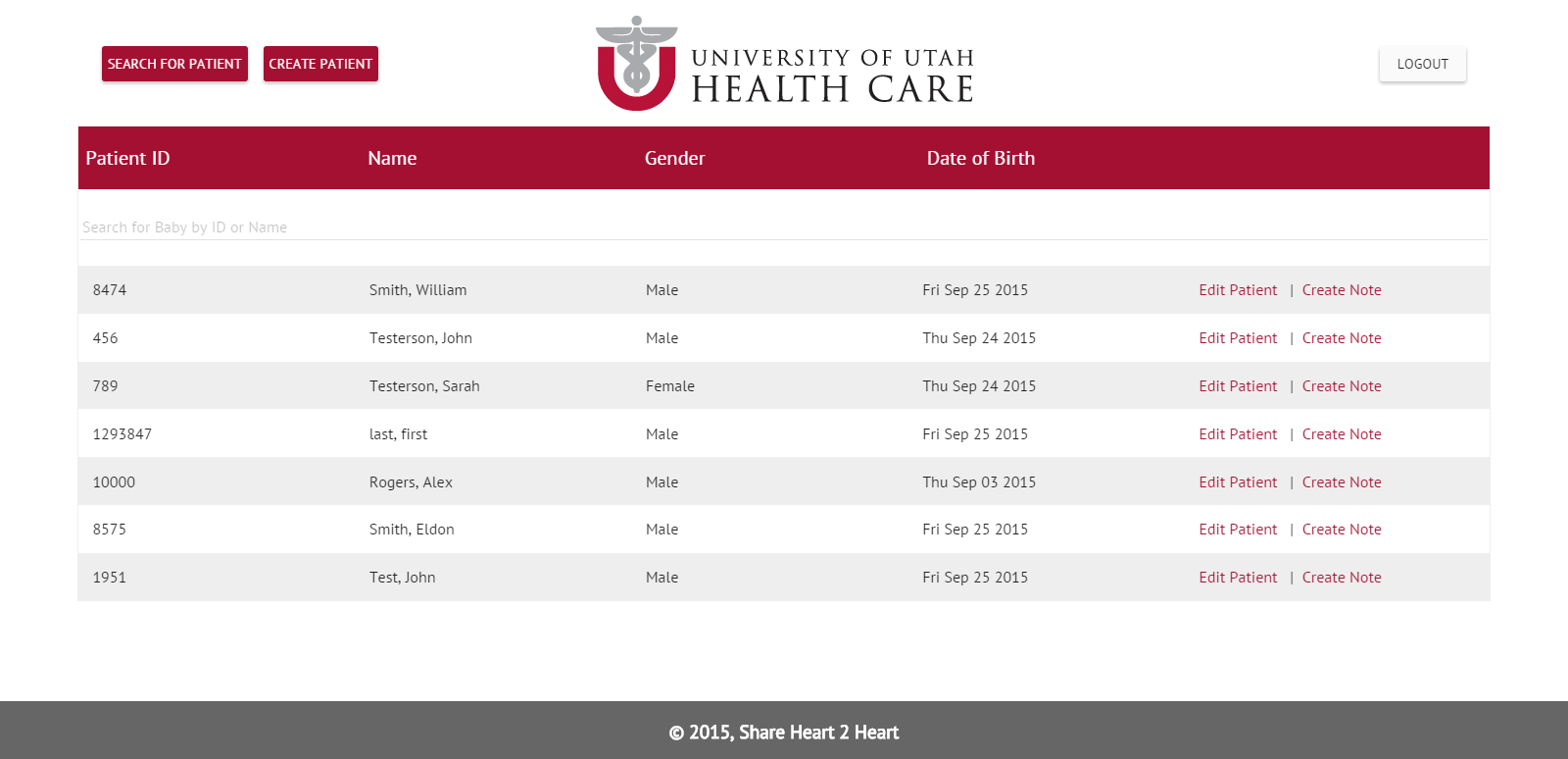The main area is a searchable list of babies in the database. From this view nurses are able to add a new baby or edit existing ones for the baby's parents to see and share.
