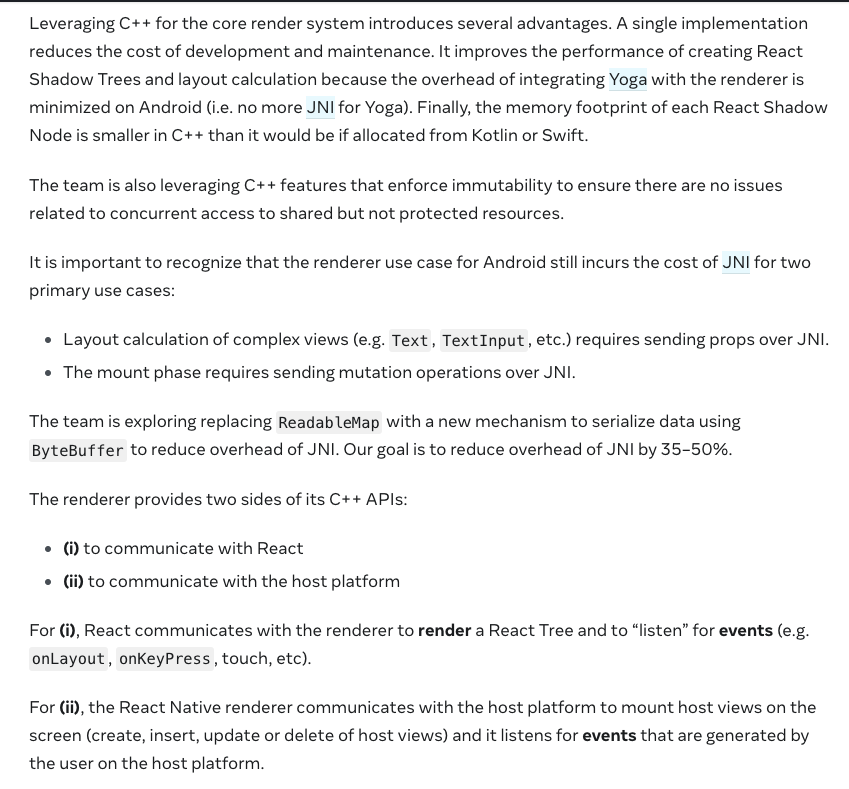 the React Native renderer communicates with the host platform to mount host views on the screen (create, insert, update or delete of host views) and it listens for events that are generated by the user on the host platform.