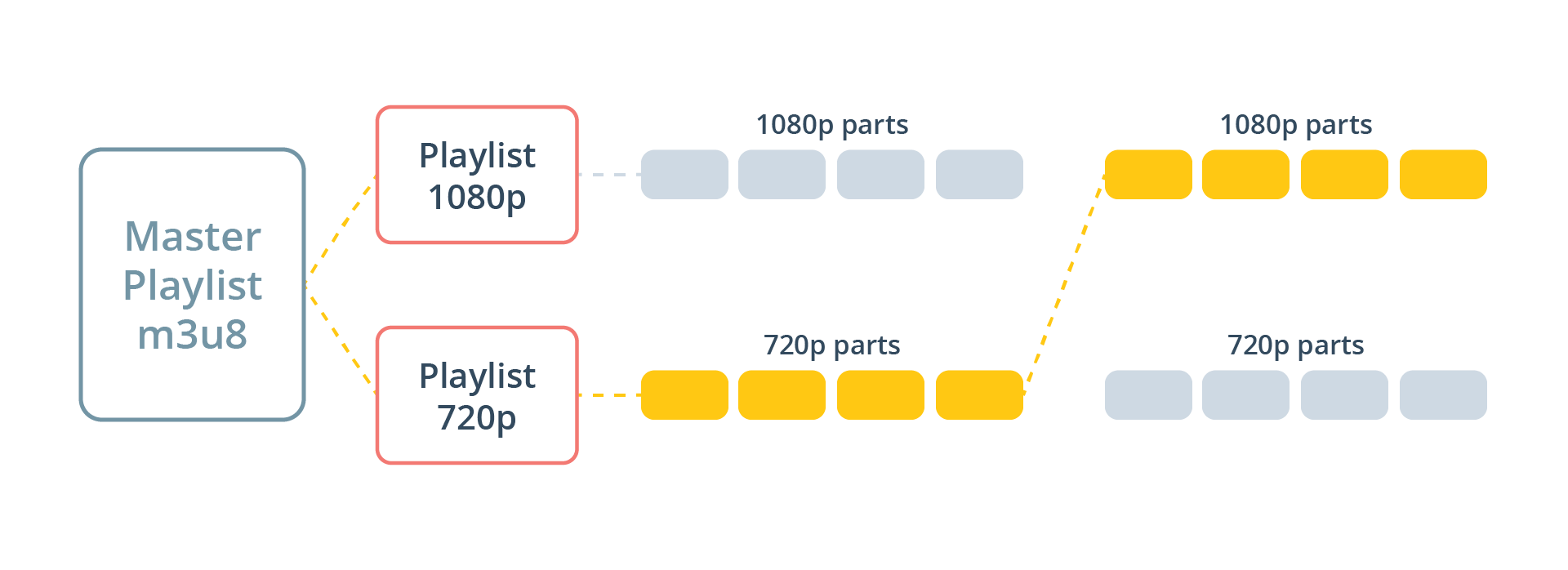 - Delivered to the browser packaged as multiple Transport Stream (.ts) or fmp4 files