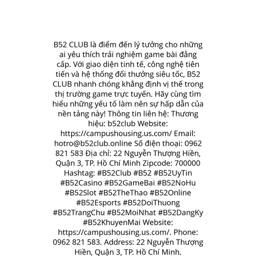 Website: https://campushousing.us.com/. B52 CLUB là điểm đến lý tưởng cho những ai yêu thích trải nghiệm game bài đẳng cấp. Với giao diện tinh tế, công nghệ tiên tiến và hệ thống đổi thưởng siêu tốc, B52 CLUB nhanh chóng khẳng định vị thế trong thị t