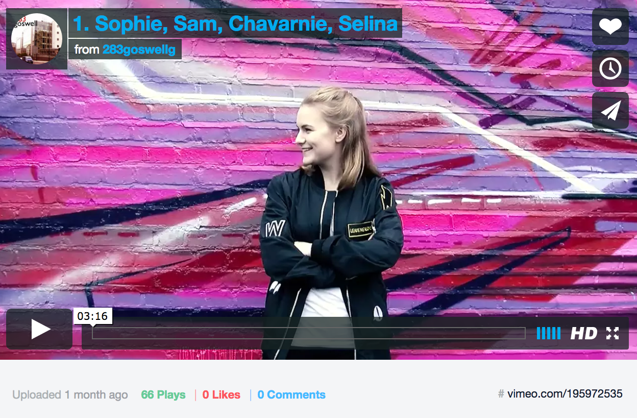 The ratings of our video are fairly okay. Given that there were a lot more people than this, it does give me less confidence in the promotion of our video or how memorable it was. I do believe that the viewings are a good thing however as it shows that others went to the vimeo, after the screening, and decided to watch the video. The other videos show that 66 is around about an average. Some videos had 30-40 views and the highest was around 100, with one video with 200+ views.