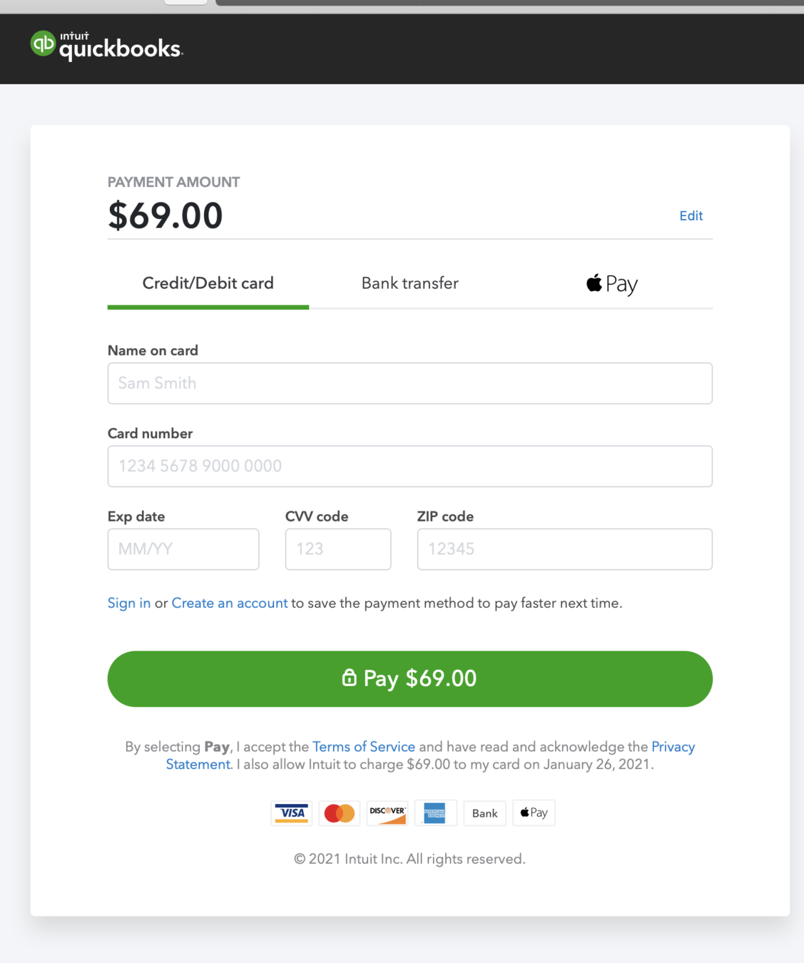 Example: QBO Take Pay Page