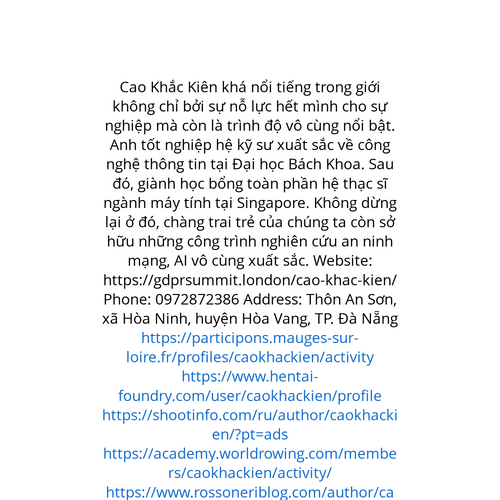 Website: https://gdprsummit.london/cao-khac-kien/ Cao Khắc Kiên khá nổi tiếng trong giới không chỉ bởi sự nỗ lực hết mình cho sự nghiệp mà còn là trình độ vô cùng nổi bật. Anh tốt nghiệp hệ kỹ sư xuất sắc về công nghệ thông tin tại Đại học Bách Khoa.