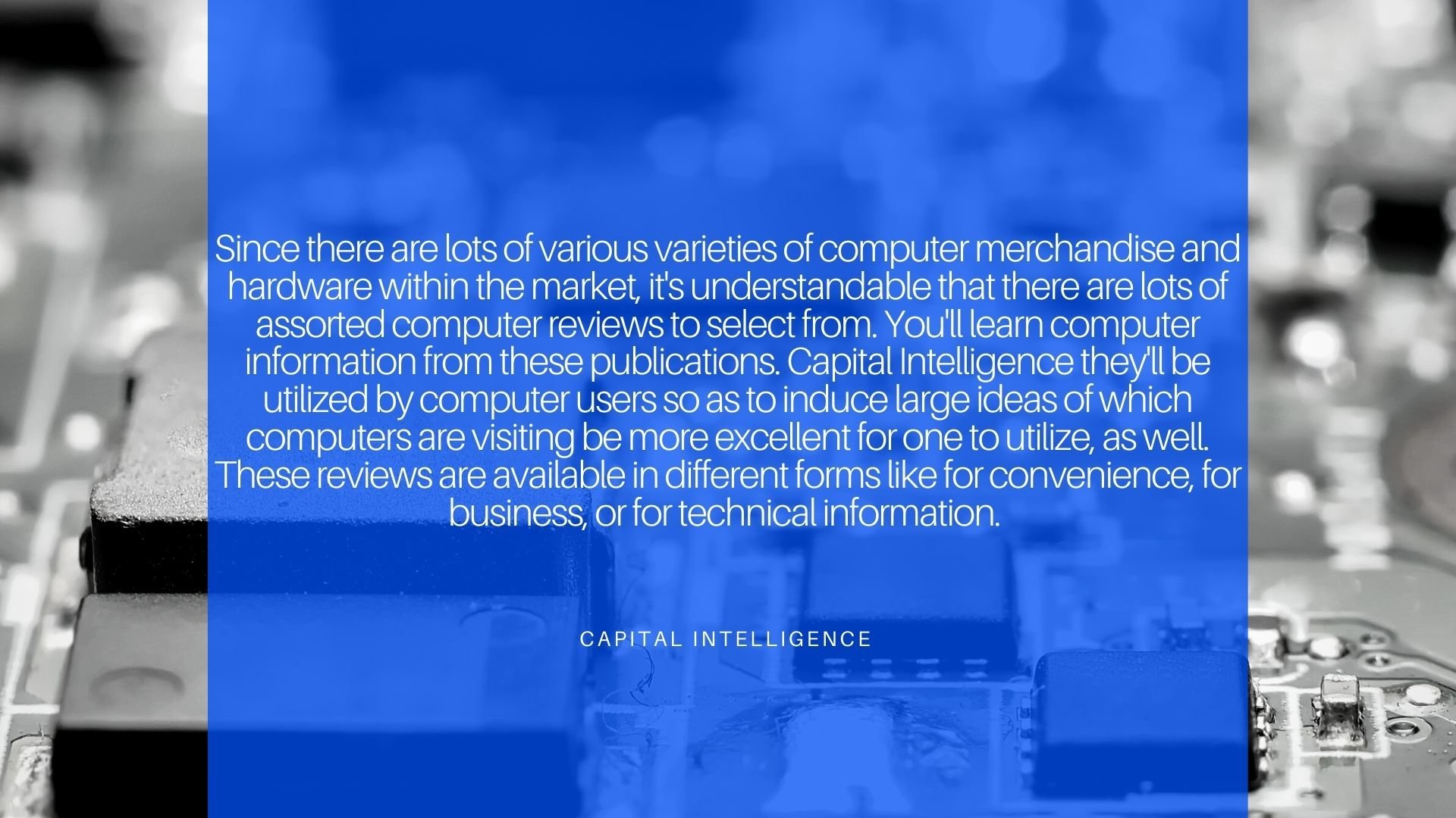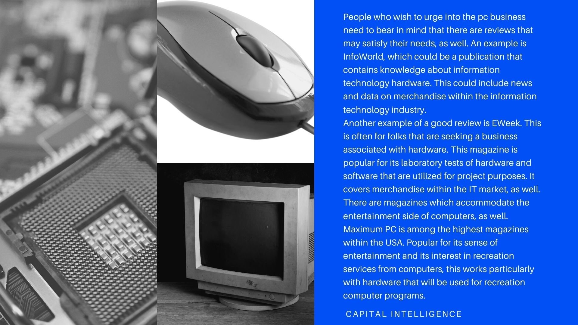 Capital Intelligence is an organization that provides hardware products and part of any computer hardware Globally. Another huge product brand within the industry of magazines is that the PC Gamer. This covers computer games further than other hardware pieces for leisure purposes. This may include audio systems, monitors, and video cards which will work finely for computers.