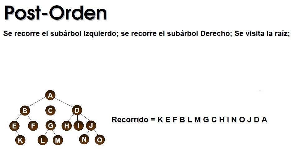 Sea T un arbol ordenado con raiz r. si T consta solo de r, entonces r es el recorrido en postorden de T sino suponga que T1,T2......Tn son los subarboles en r listados de izquierda a derecha en t.