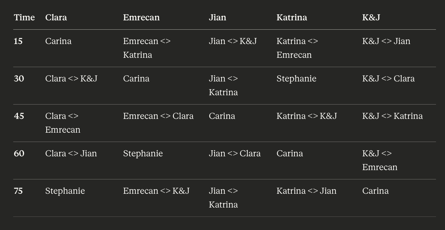 | 15–30 | GH ↔ Katrina | GH ↔ Jan+Katrin | Present → Emrecan | Listen to Jian | Carina |