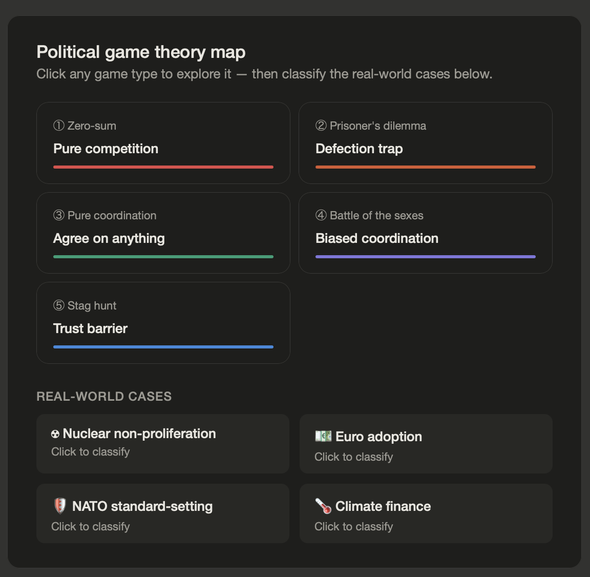 International institutions (WTO, NATO, climate agreements) can be understood as attempts to move actors from Pareto-inferior Nash equilibria toward Pareto-superior cooperative outcomes.