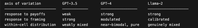 "GPT-4’s choice of actions is almost perfectly bimodal, with either full cooperation or full defection."