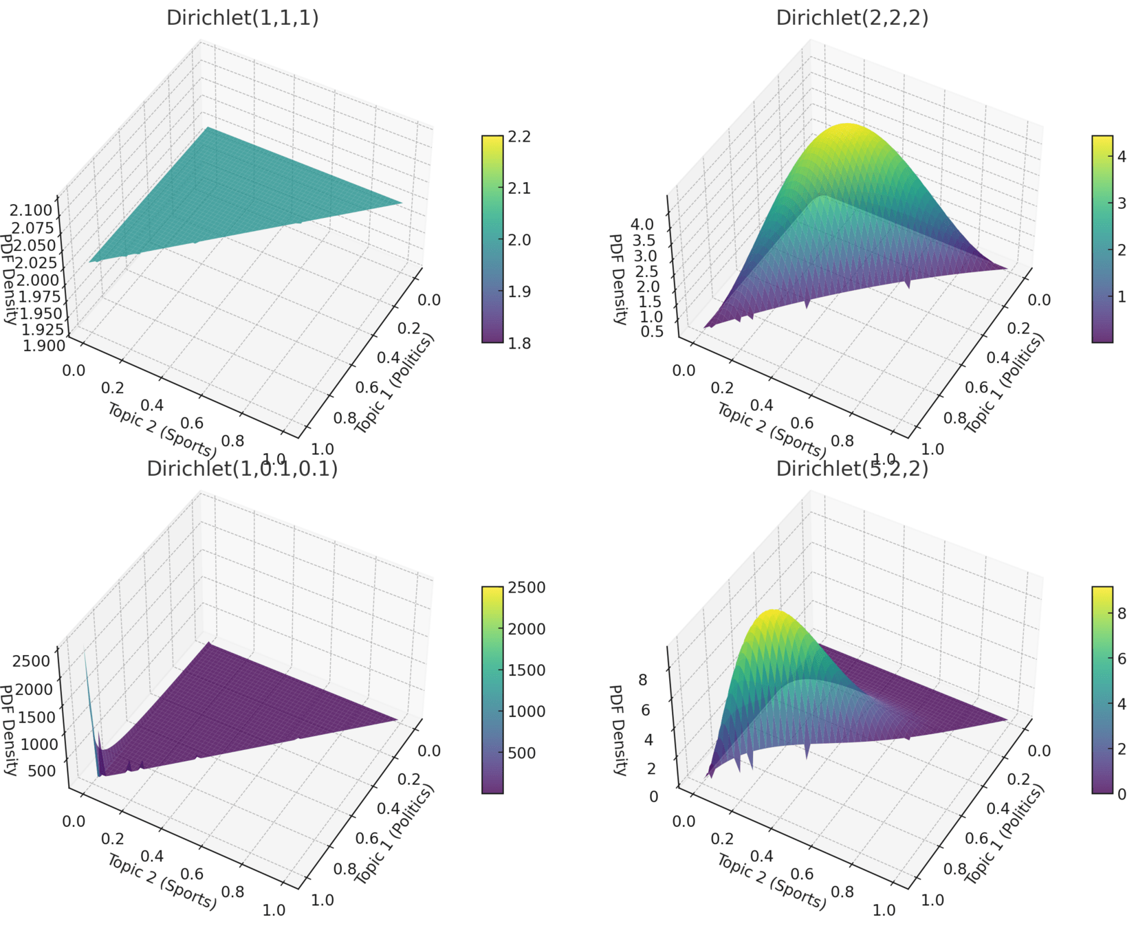 alpha = np.array([0.5, 0.5, 0.5]) # Prior for document-topic distribution (θ) #TRY
