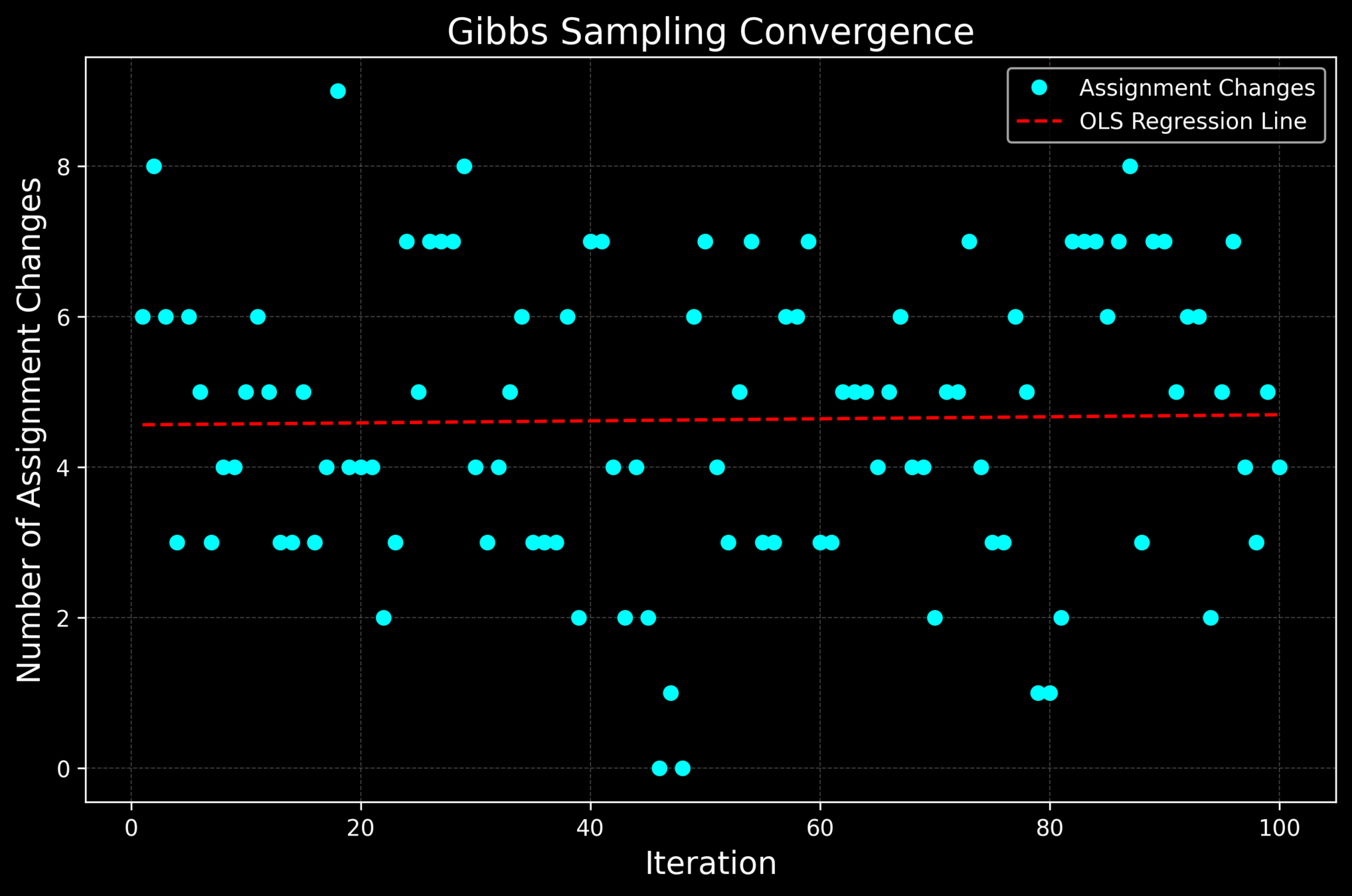 In LDA, we want to sample from the posterior \( p(\theta, z, \phi \mid w, \alpha, \beta) \) but it’s intractable. Instead, Gibbs sampling iteratively samples from conditional distributions, building a Markov Chain that eventually converges to the true posterior.