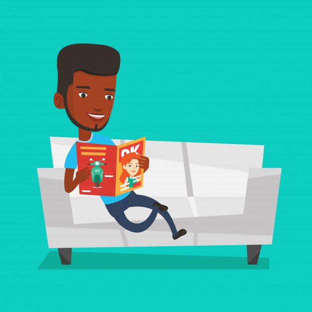 Ele está a ler uma revista.