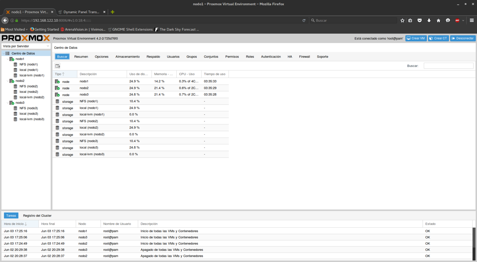 Visión general de Proxmox VE con los nodos añadidos.